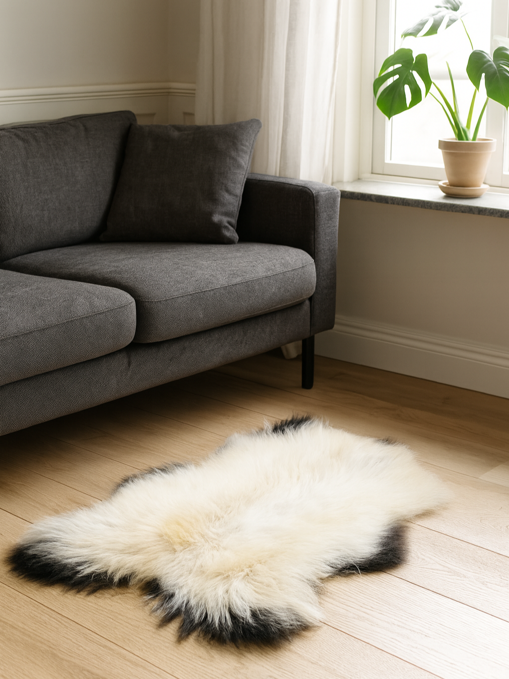 Diese spezifische Rasse zeichnet sich durch ihr weiß-beiges Fell mit schwarzfarbenen Beinen aus. Die Felle in der Variante „Gólsótt“ (Dachszeichnung) zeigen ein charakteristisches Muster – dunklere Bereiche um Kopf und Beine, kombiniert mit einem hellen, weiß-beigen Körper. Jedes Fell ist ein Unikat der Natur und bringt nordische Ursprünglichkeit und Wärme in jedes Zuhause.