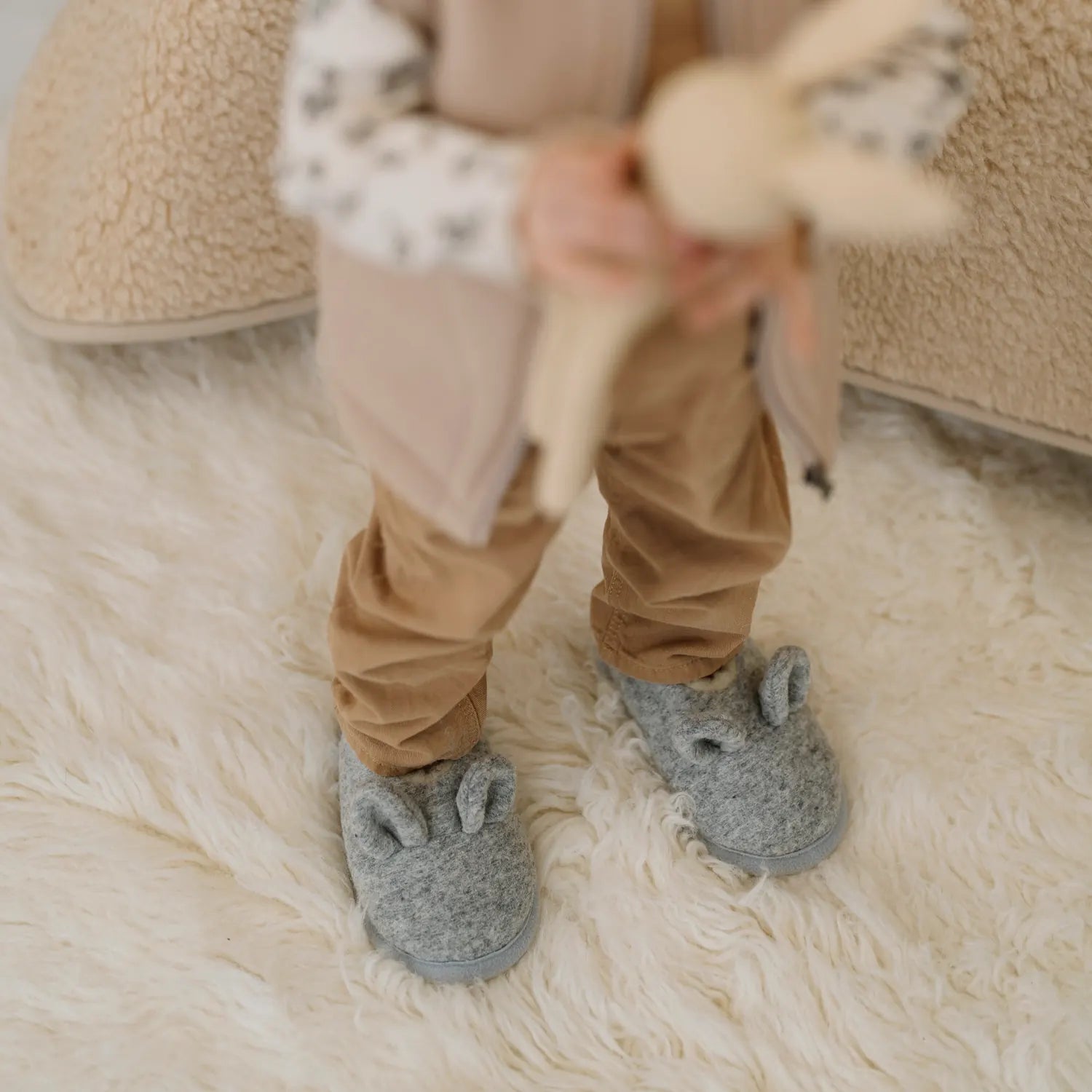 Die Kinderhausschuhe „Maus“ sind aus weicher Merinowolle gefertigt – ideal für ruhige Momente zu Hause. Die kleinen Ohren verleihen ihnen einen verspielten Charakter, während die natürliche Wolle die Füße angenehm warm hält, selbst auf kalten Böden.