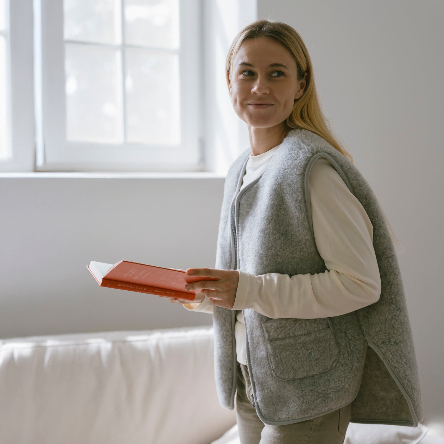 Diese Merino-Wollweste steht ganz im Zeichen natürlicher Bequemlichkeit. Sie fühlt sich weich und angenehm an, spendet Wärme ohne zu beschweren und lässt die Haut atmen. Man kann sie über einem Hemd oder Pullover tragen – zu Hause, draußen oder überall dort, wo man sich wohlfühlen möchte.
