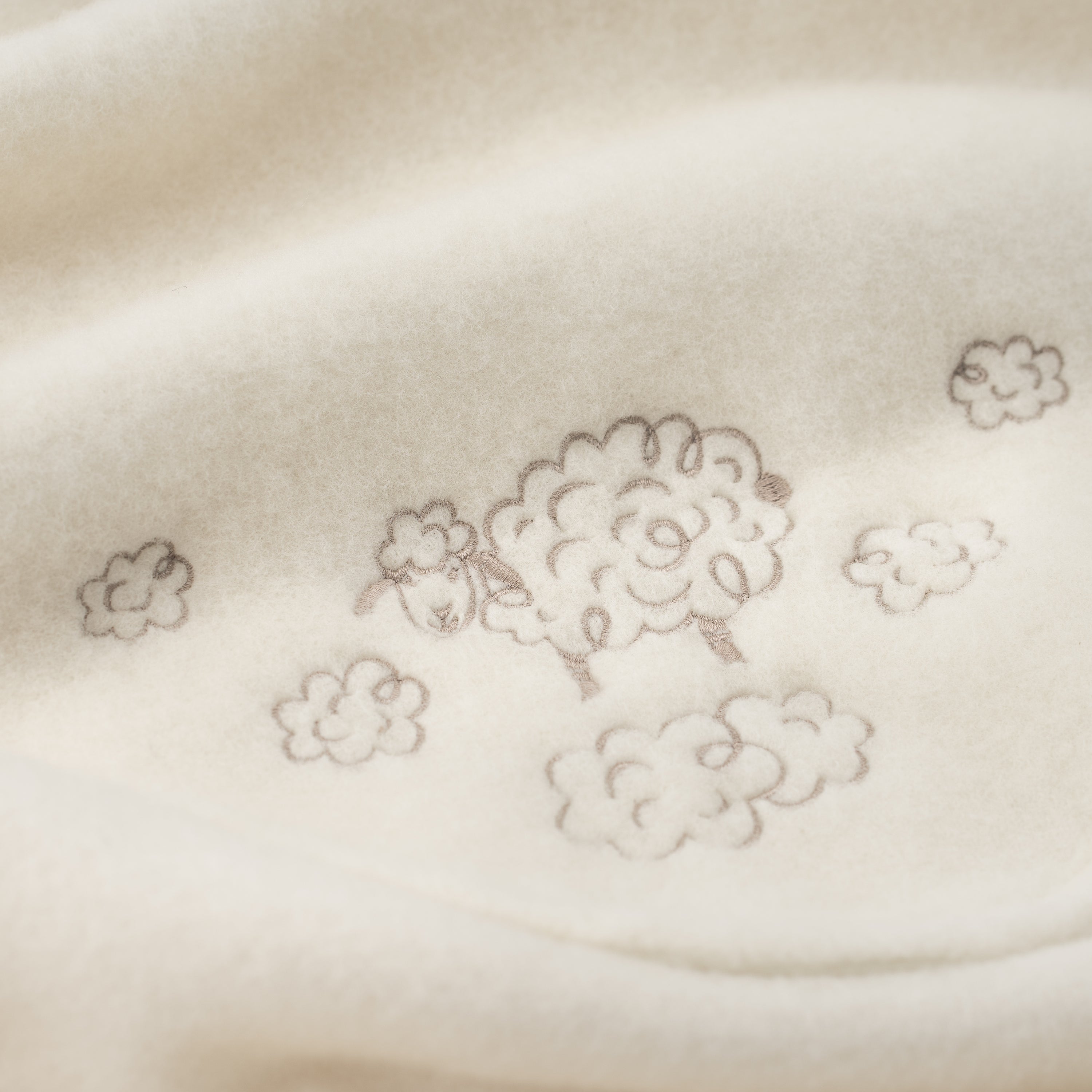 Jede Decke wird in Europa aus zertifizierter Merinowolle gefertigt. Der ruhige Beigeton passt wunderschön in jedes Kinderzimmer, und das kleine bestickte Schaf verleiht ihr einen liebevollen, verspielten Akzent. Ideal für das Kinderbett, den Kinderwagen oder für gemeinsame Kuschelzeiten.