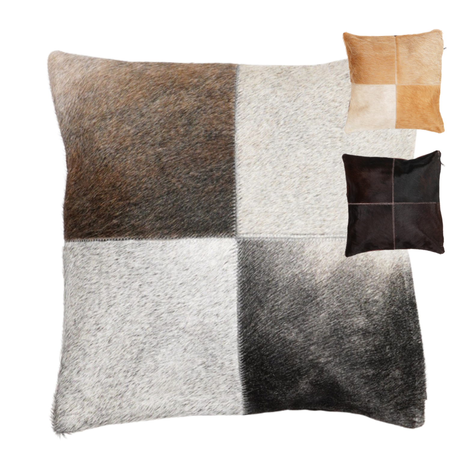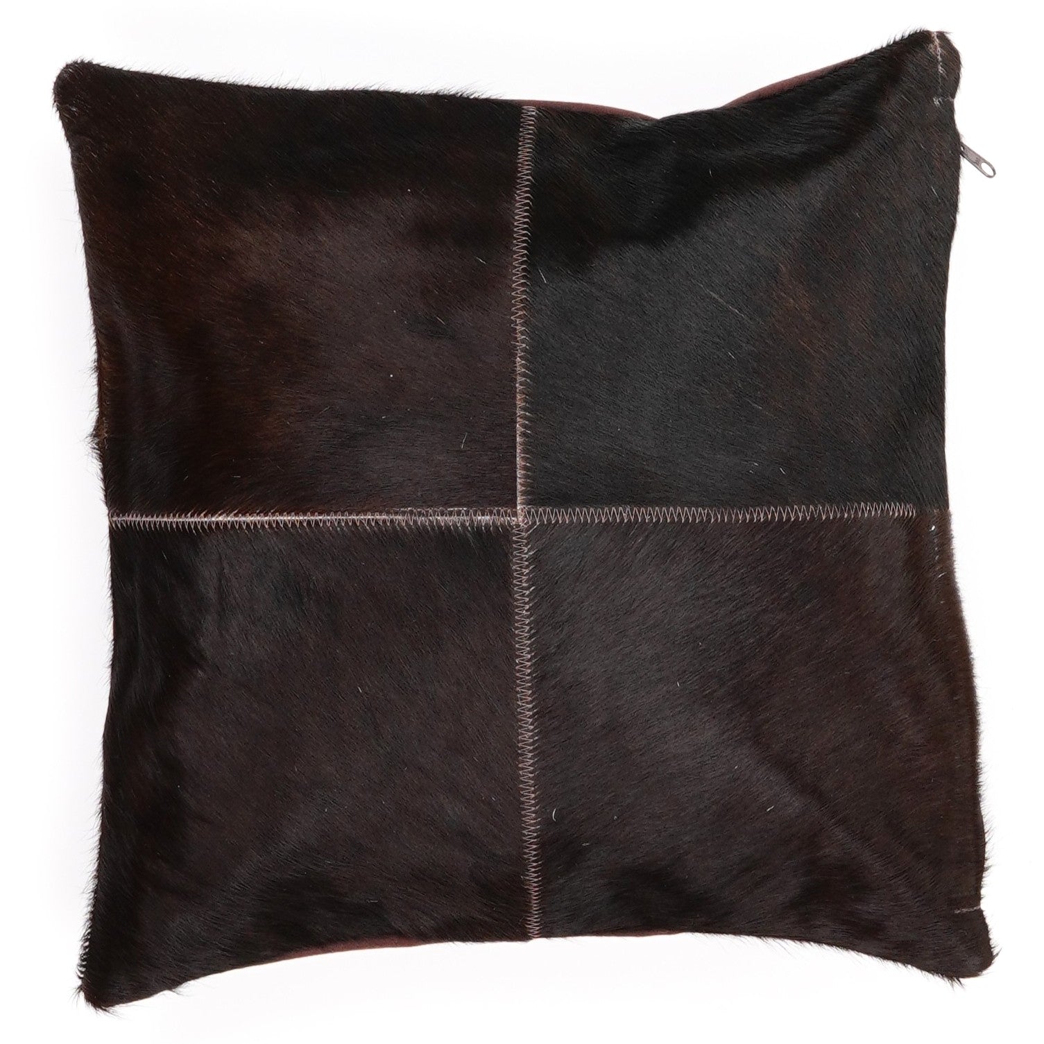 Jedes Kissen ist handgefertigt und besteht aus vier sorgfältig ausgewählten, quadratischen Patches echten Kuhfells, die von Hand zu einem modernen, markanten Patchwork vernäht werden.