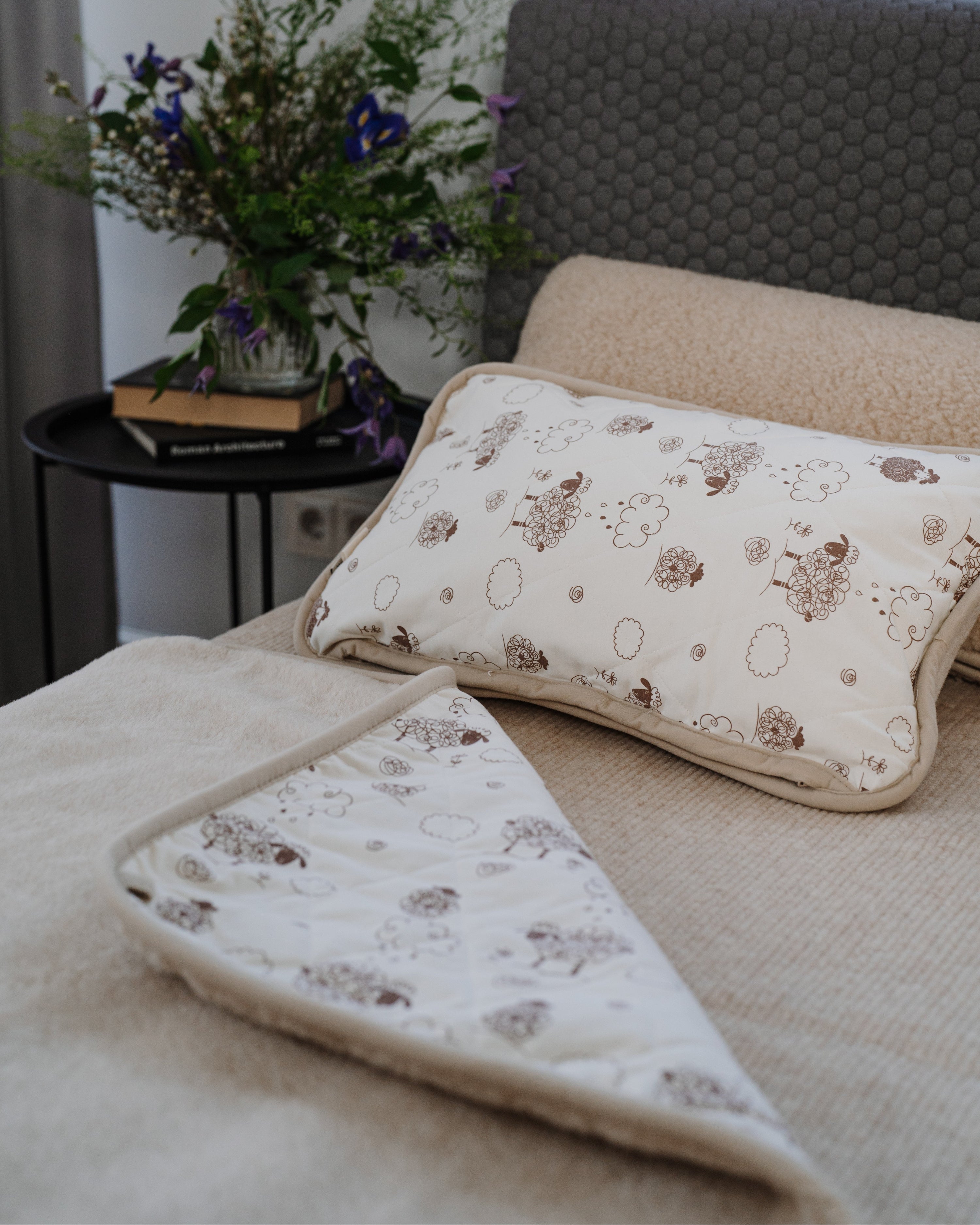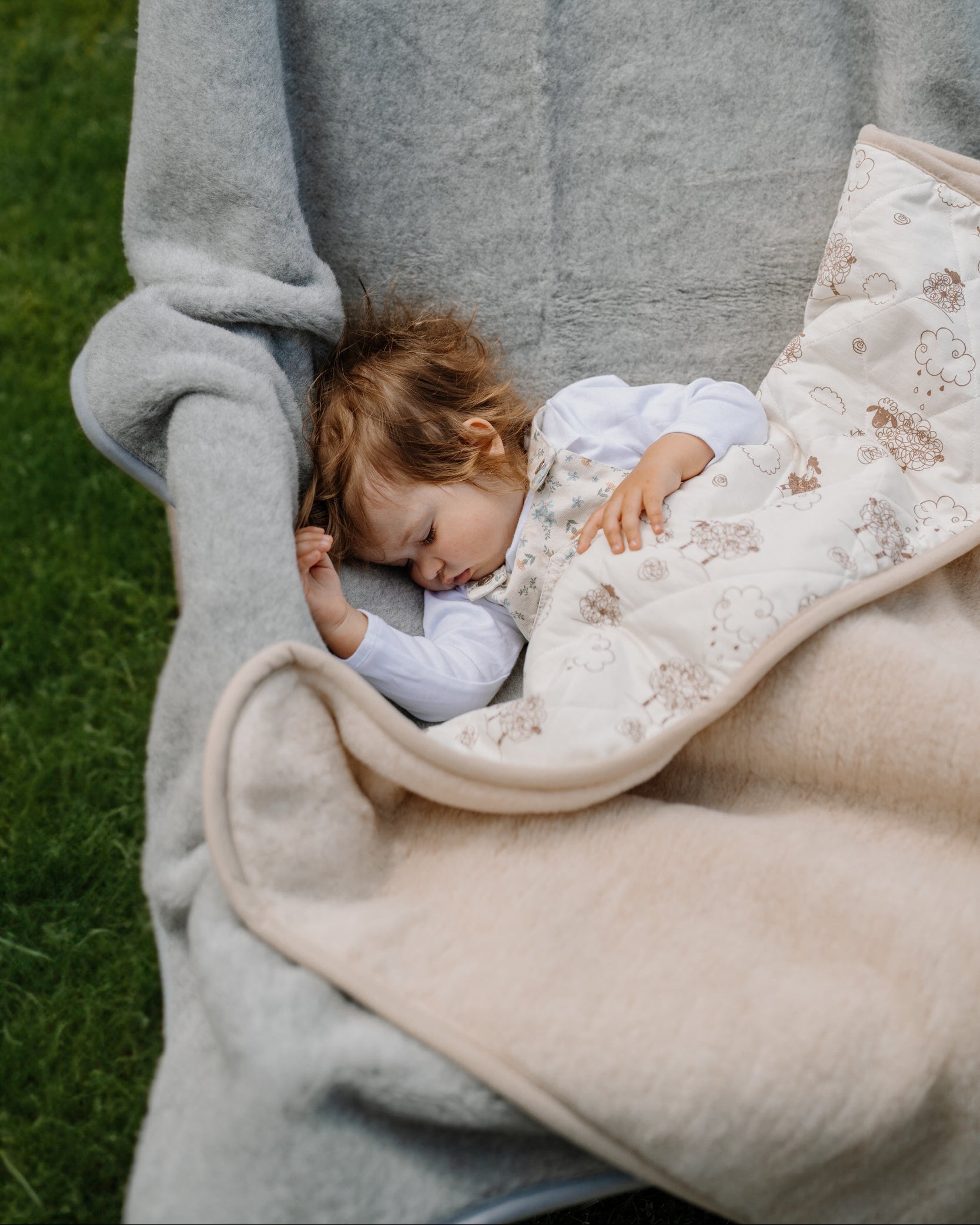 Die Kinderdecke „Zimt“ hüllt Ihr Kind in die sanfte, natürliche Wärme von Kamel- und Merinowolle. Eine Seite besteht aus weichem Wollflor, der warm und angenehm auf der Haut liegt, während die Baumwollrückseite die Decke leicht und atmungsaktiv macht. Die perfekte Kombination aus Weichheit und Geborgenheit – ideal für Nickerchen, Vorlesezeit oder ruhige Abende zu Hause.