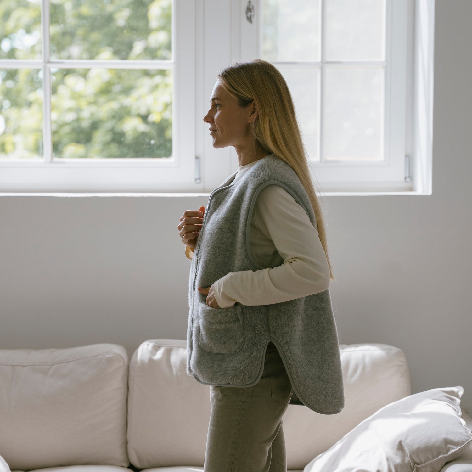 Diese Merino-Wollweste steht ganz im Zeichen natürlicher Bequemlichkeit. Sie fühlt sich weich und angenehm an, spendet Wärme ohne zu beschweren und lässt die Haut atmen. Man kann sie über einem Hemd oder Pullover tragen – zu Hause, draußen oder überall dort, wo man sich wohlfühlen möchte.